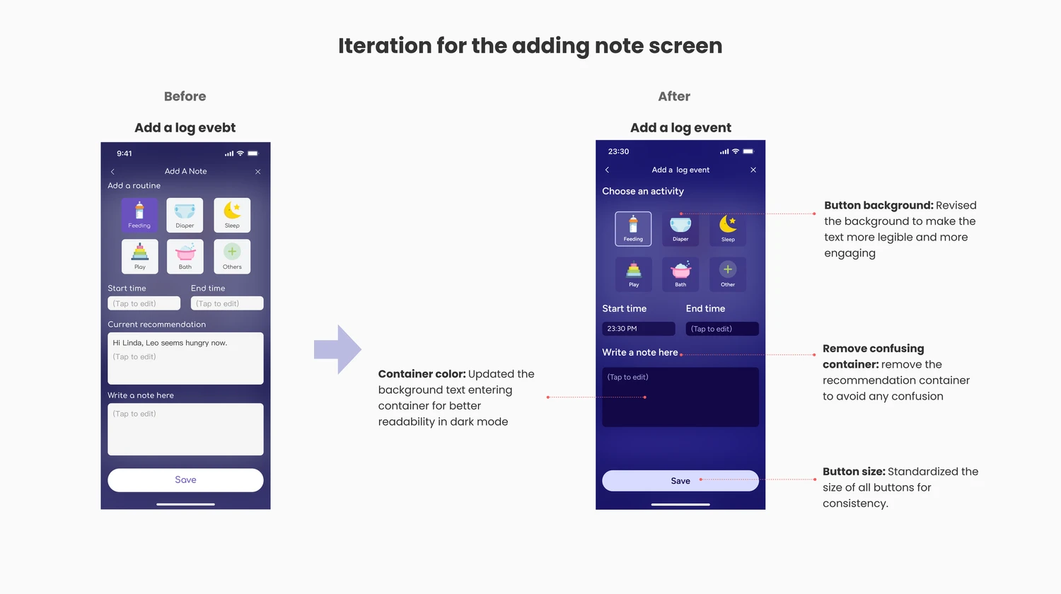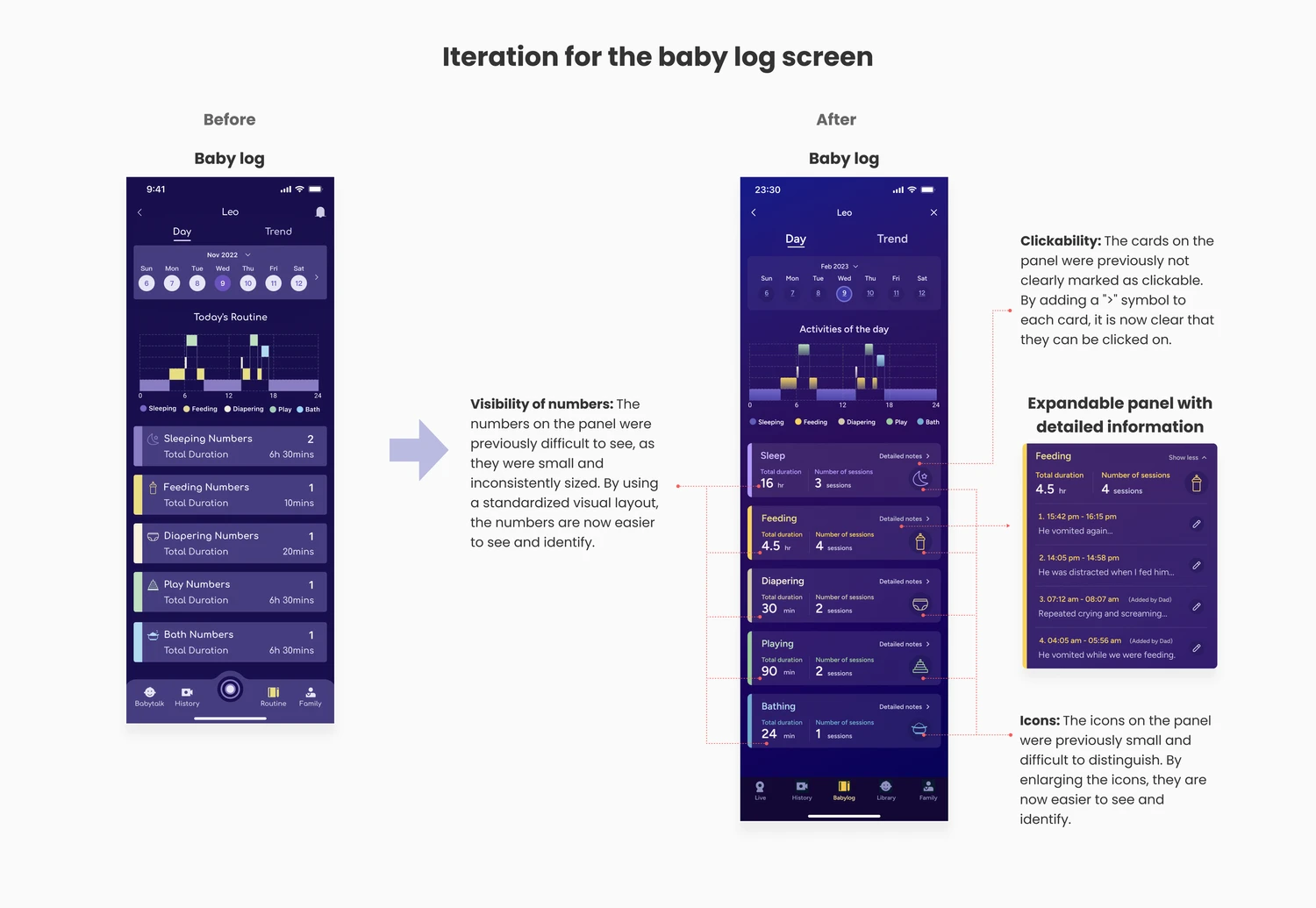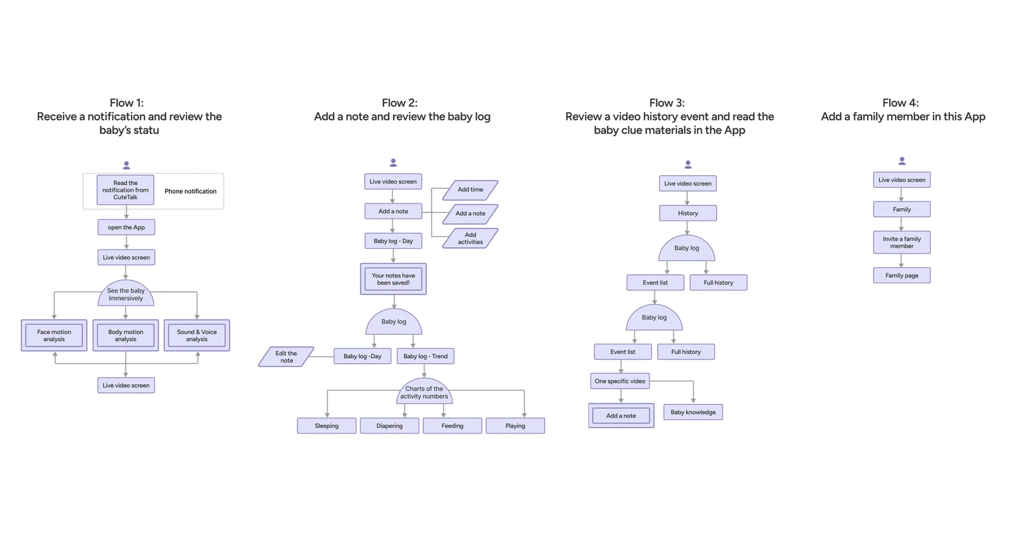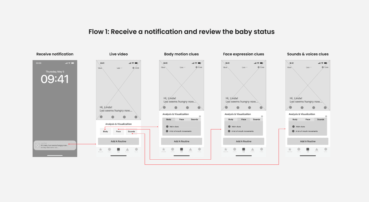 I identified the critical red routes: opening the app during a crying episode, checking the baby’s state, understanding “why,” logging an event, and inviting support.