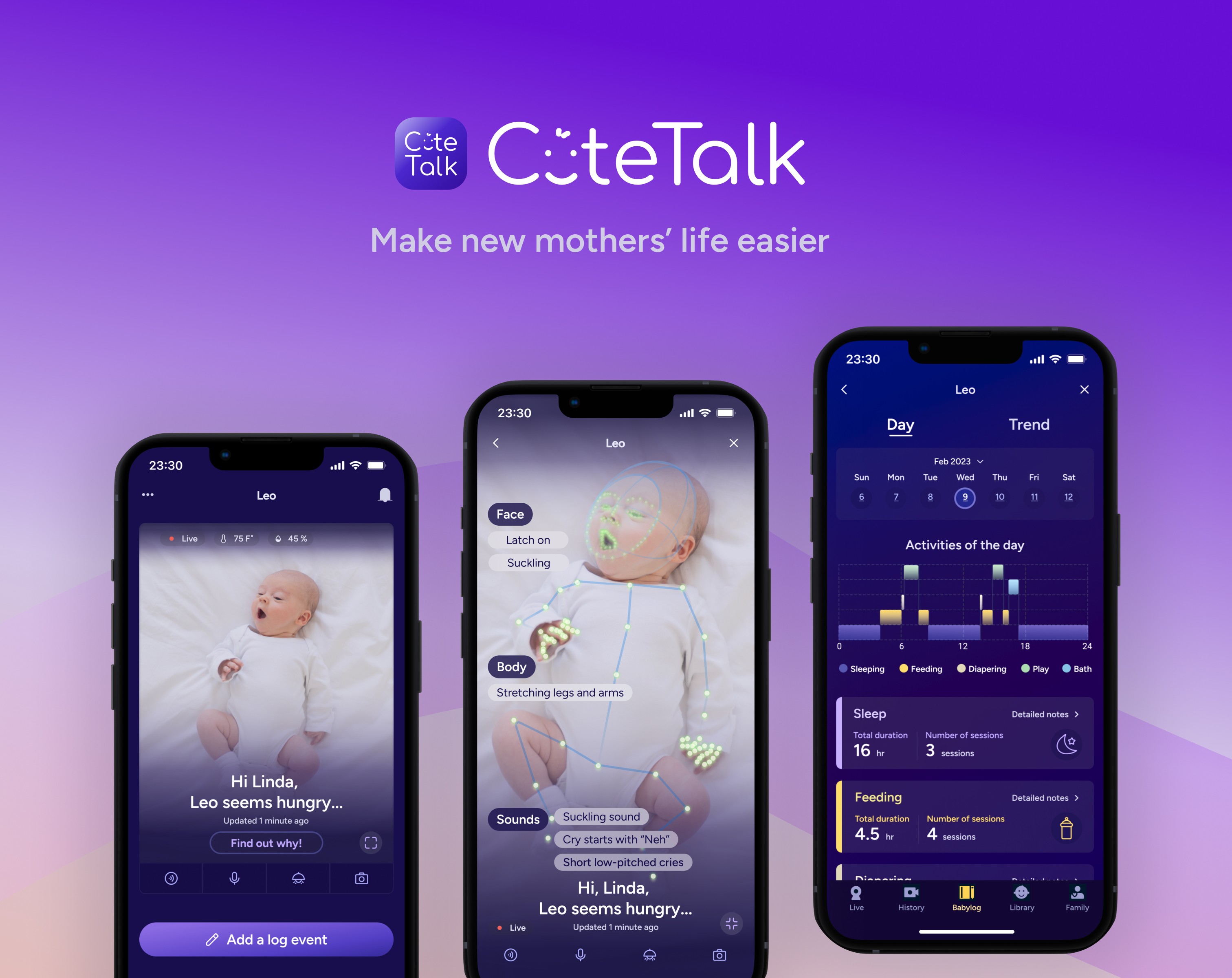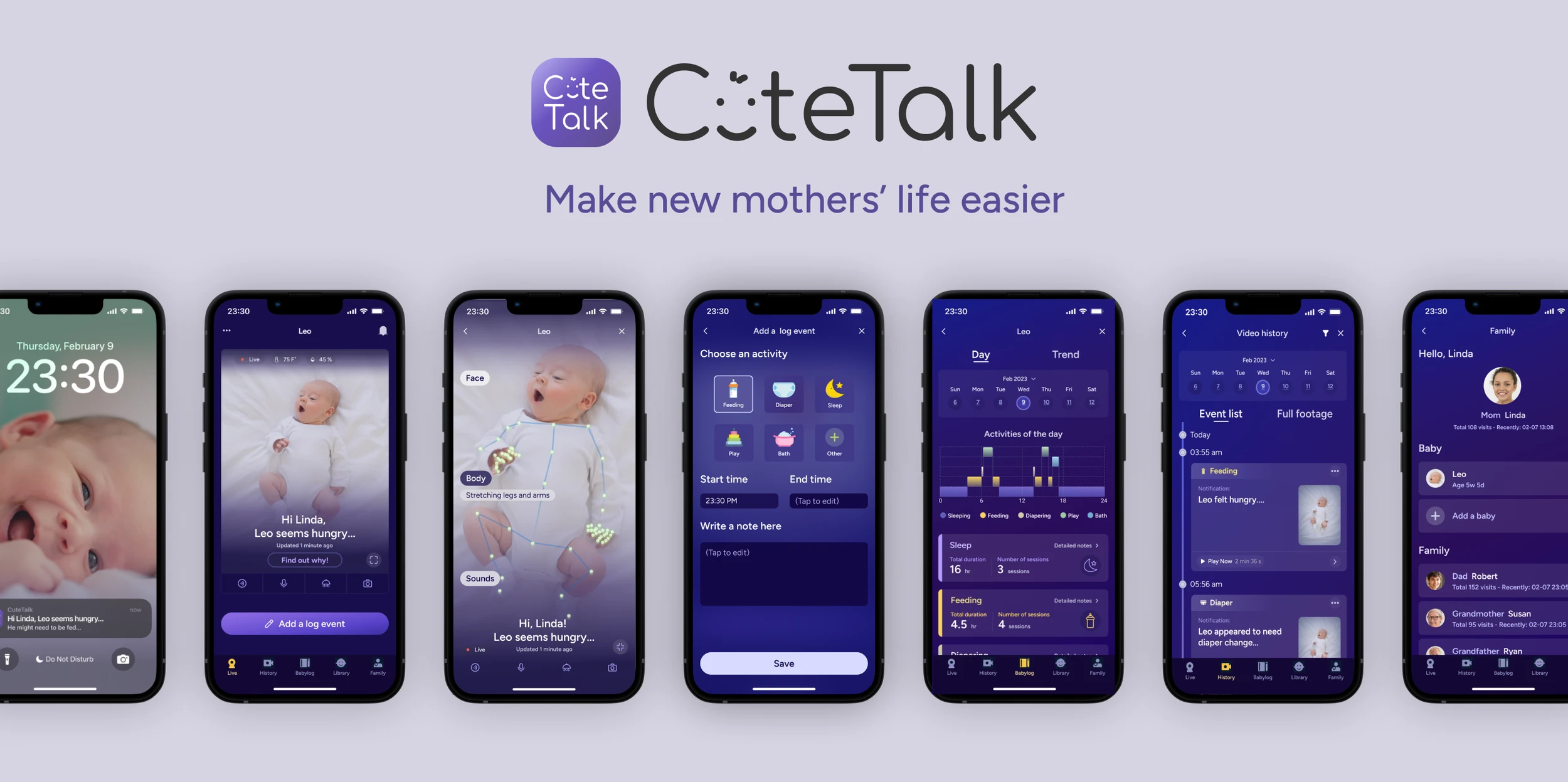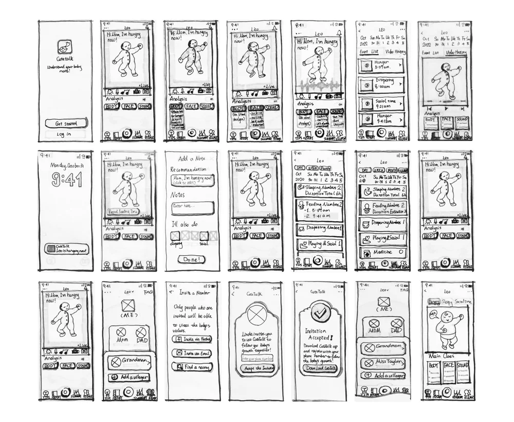 CuteTalk is an AI-driven mobile app that uses live video data to analyze a baby’s facial expressions, body movements, and sounds, providing real-time guidance to help new mothers soothe their baby with confidence.