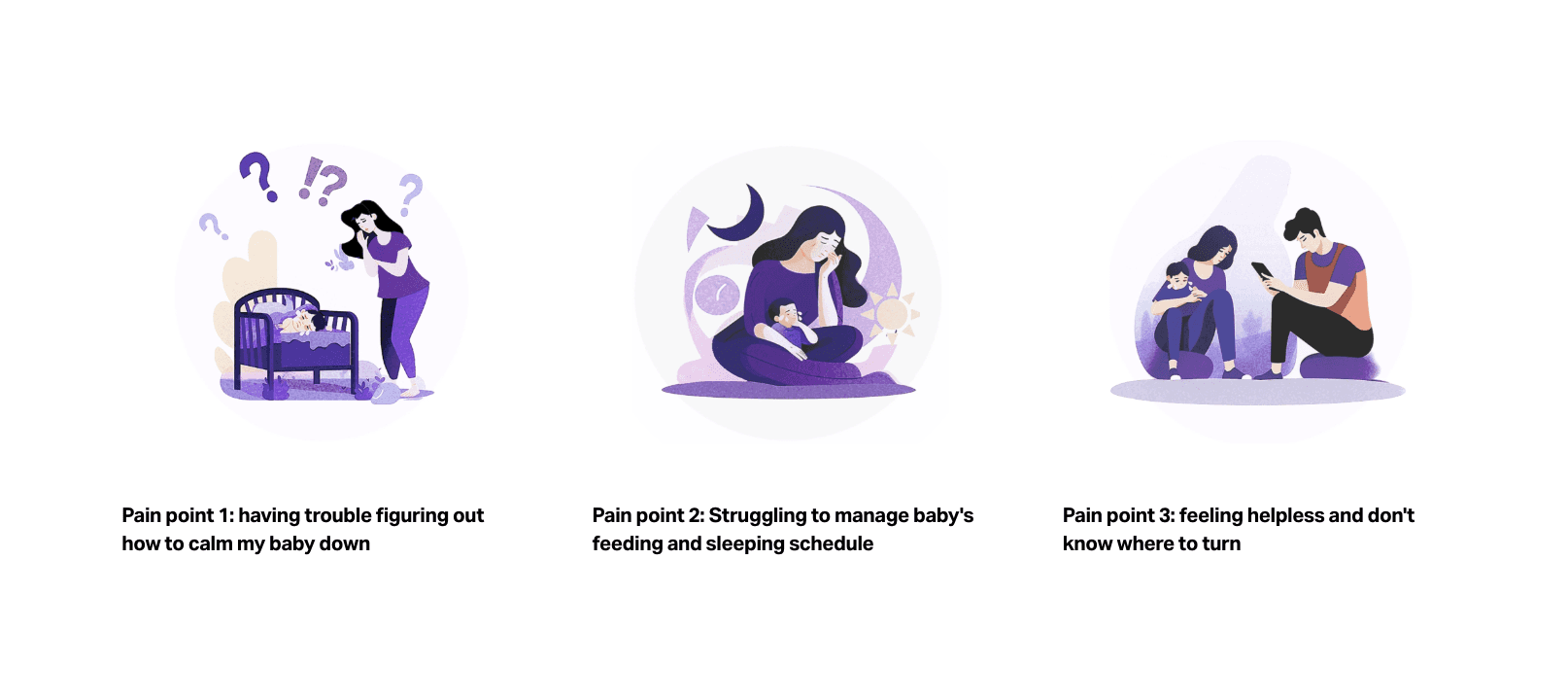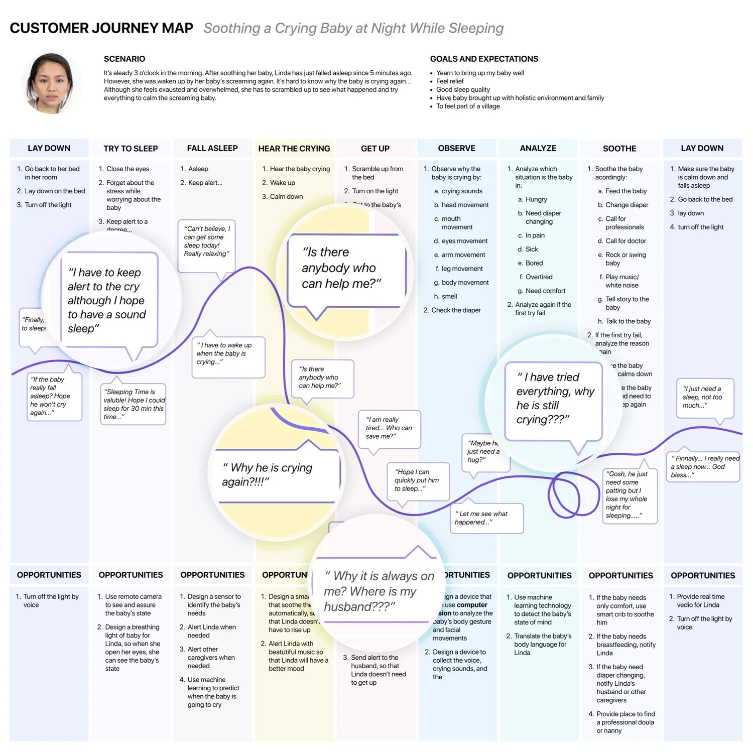 Before designing screens, I mapped the emotional and behavioral journey of a sleep-deprived mother in real moments of stress.