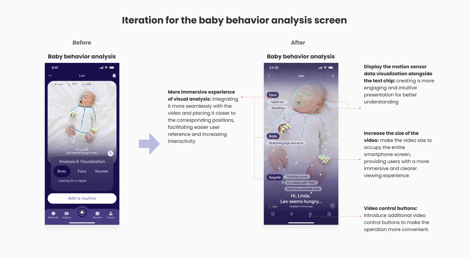 Baby states: Algorithms analyze camera data to show users their baby's possible status, needs, and thoughts.