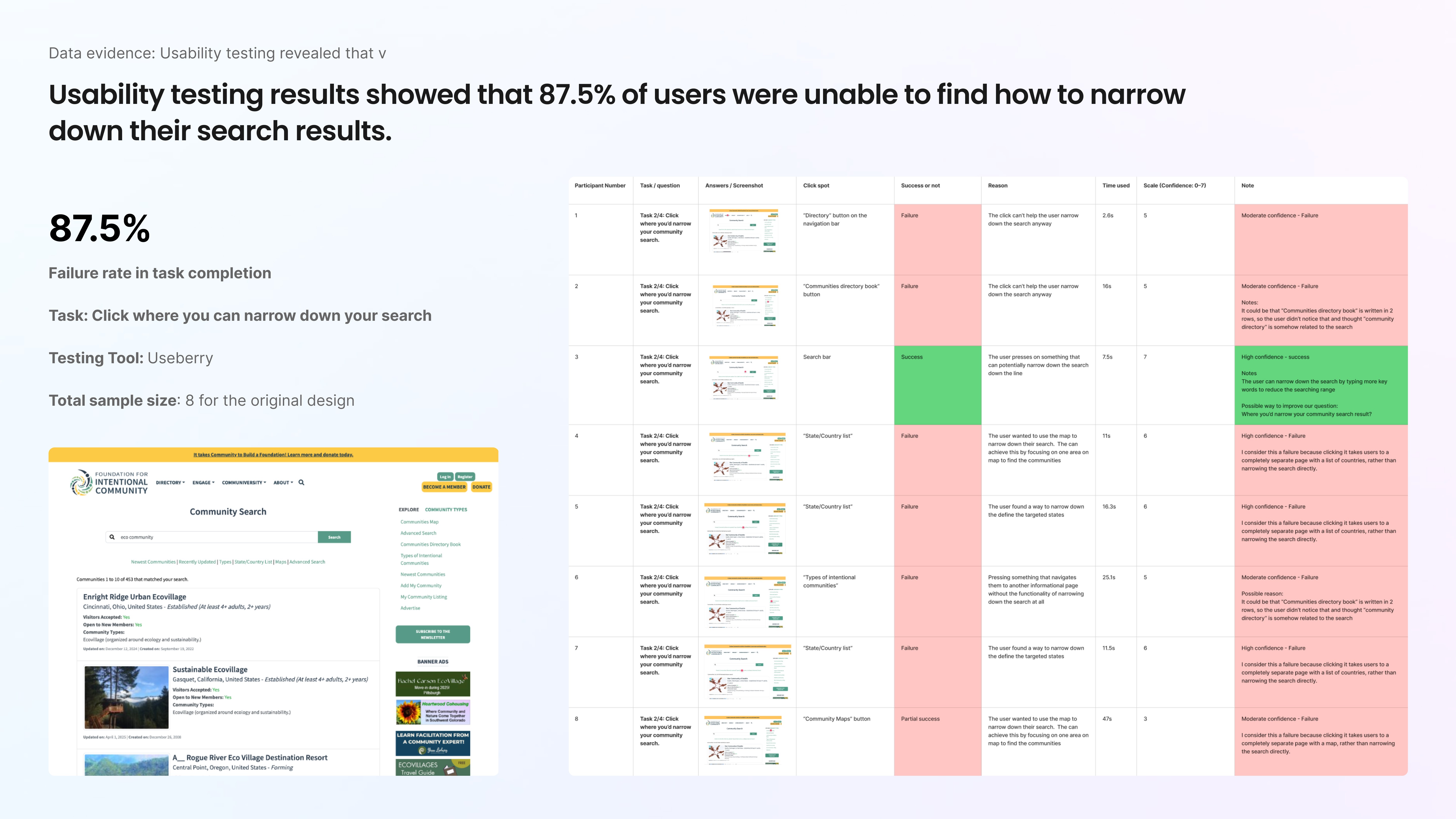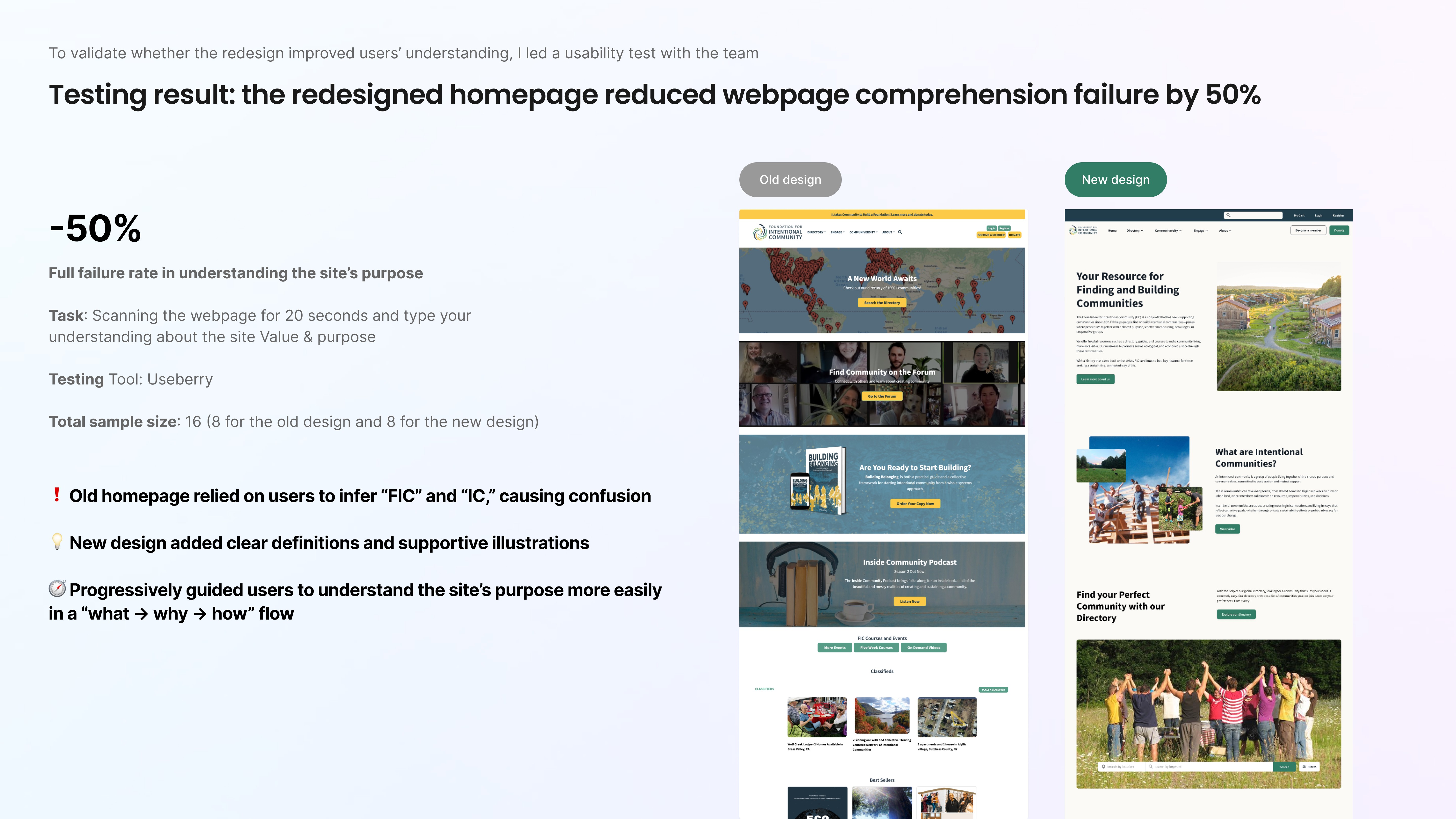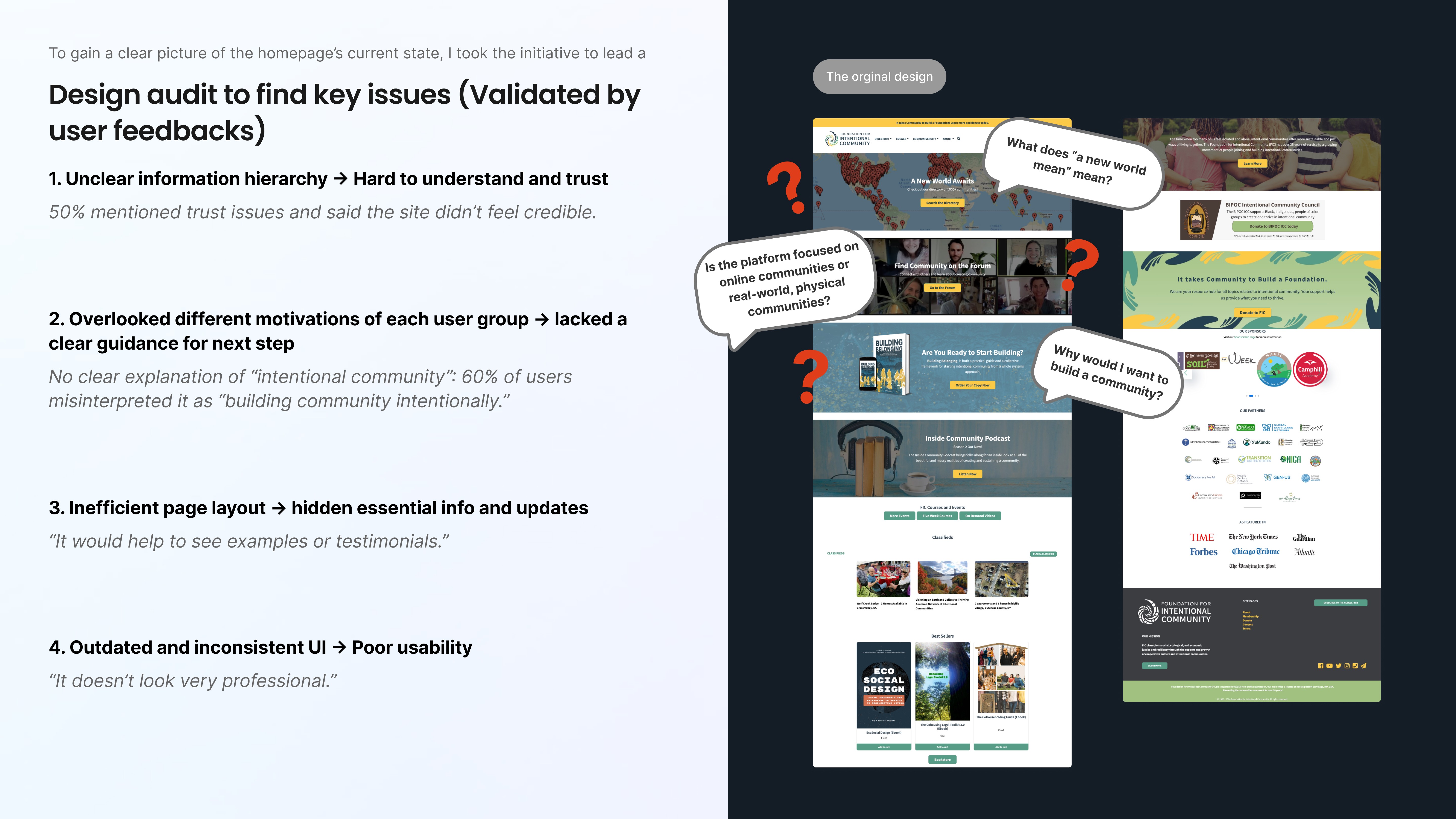 Confusing information hierarchy: first-time visitors struggled to understand what FIC or “intentional communities” meant.
