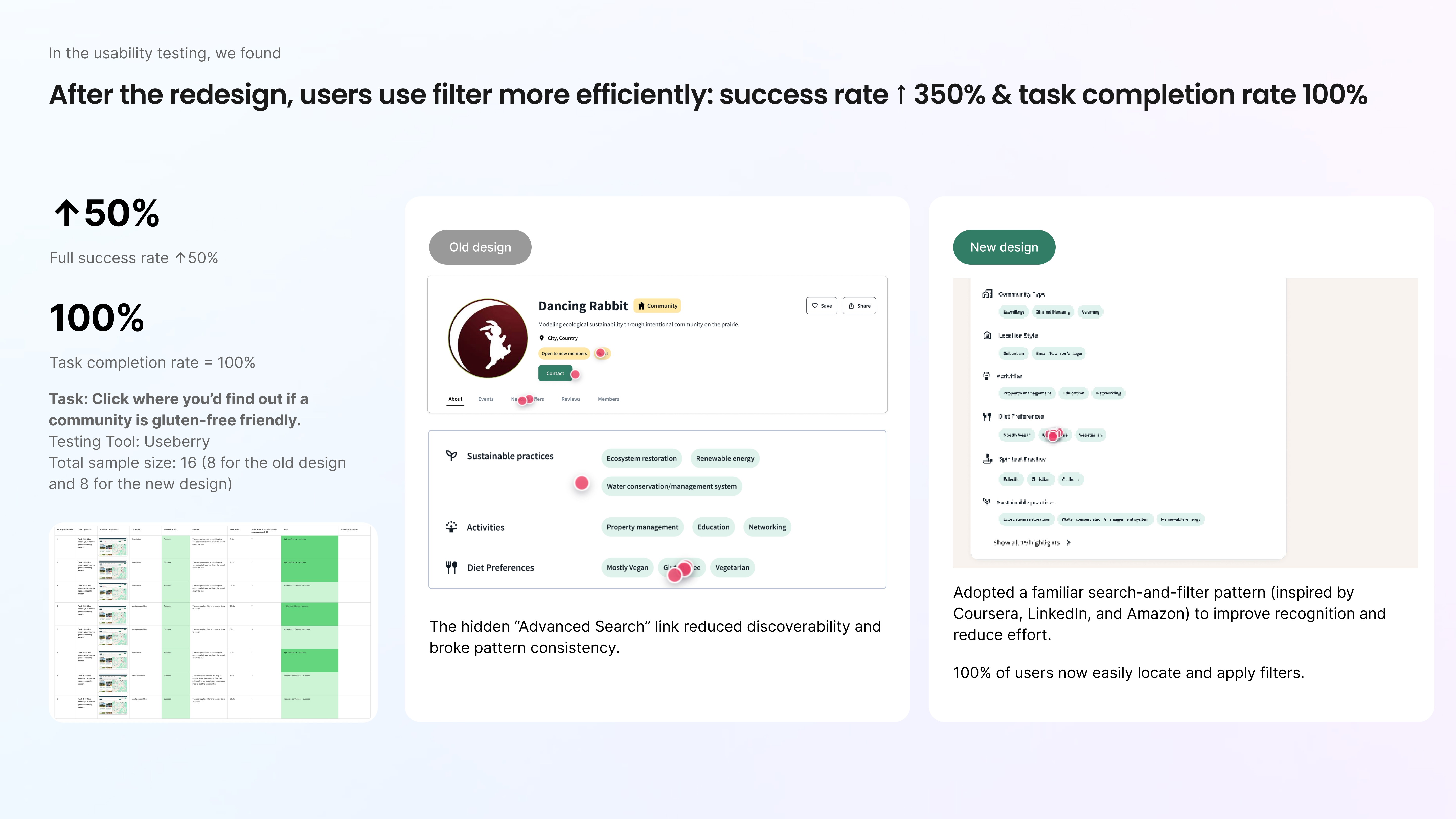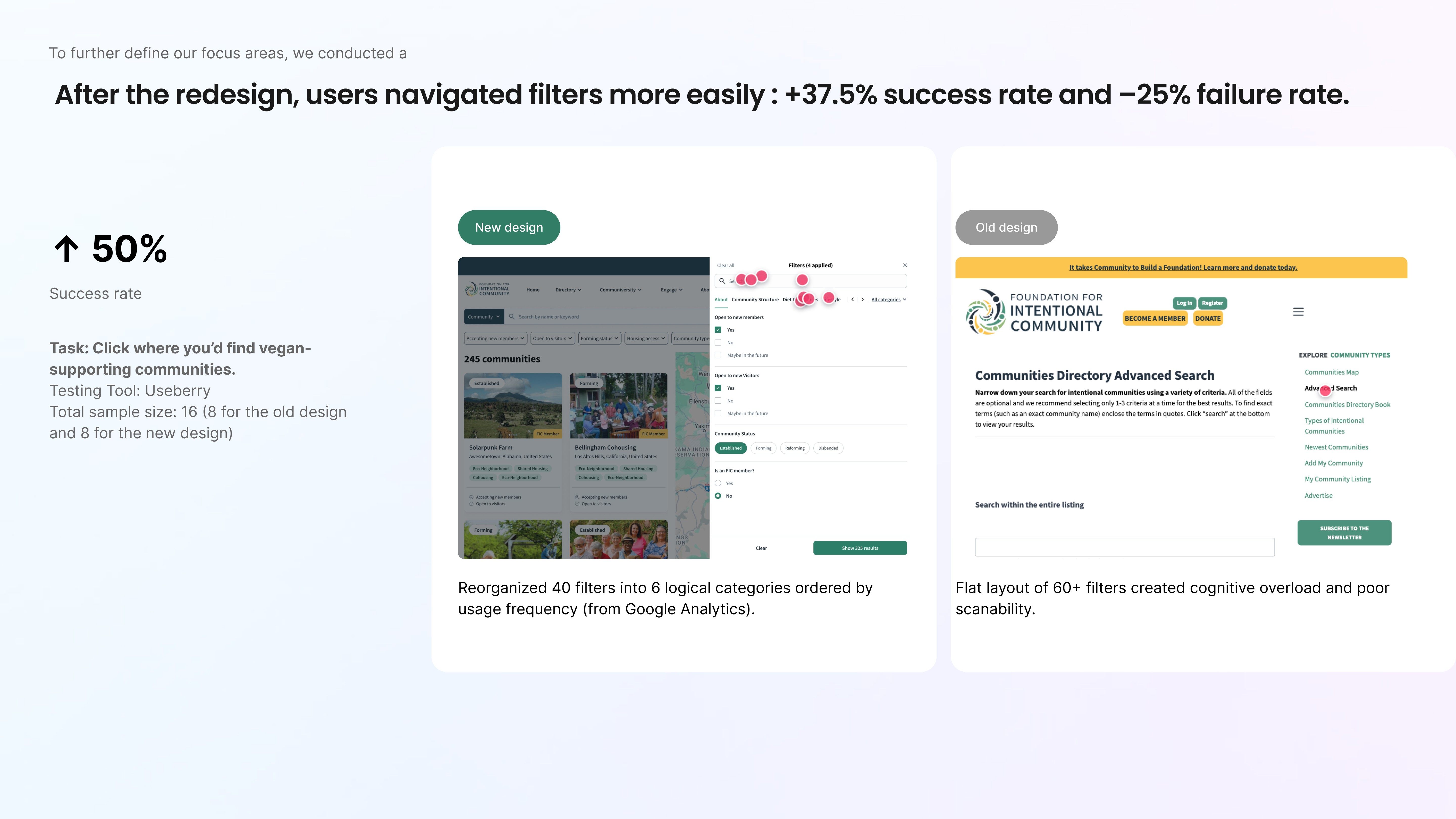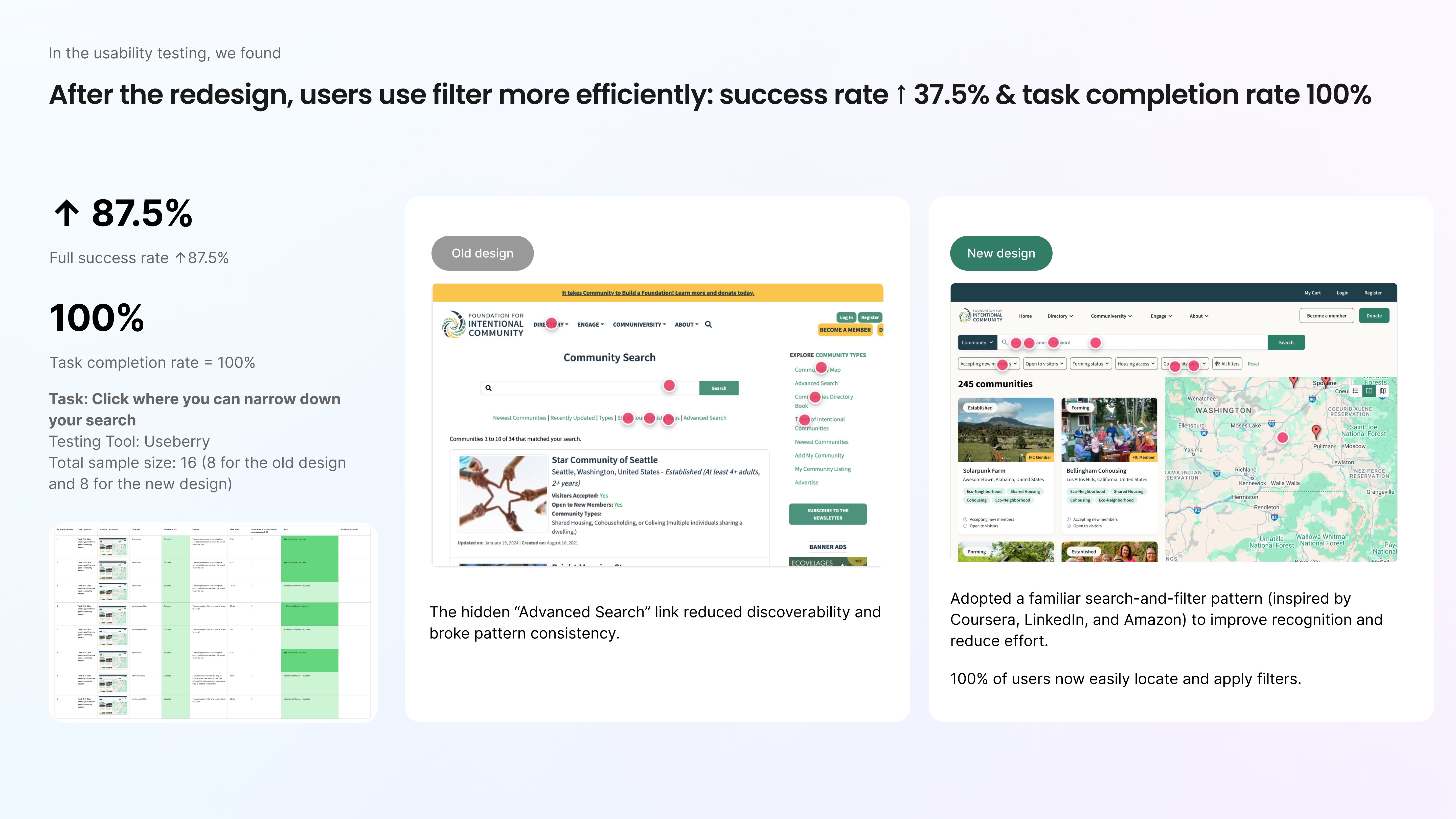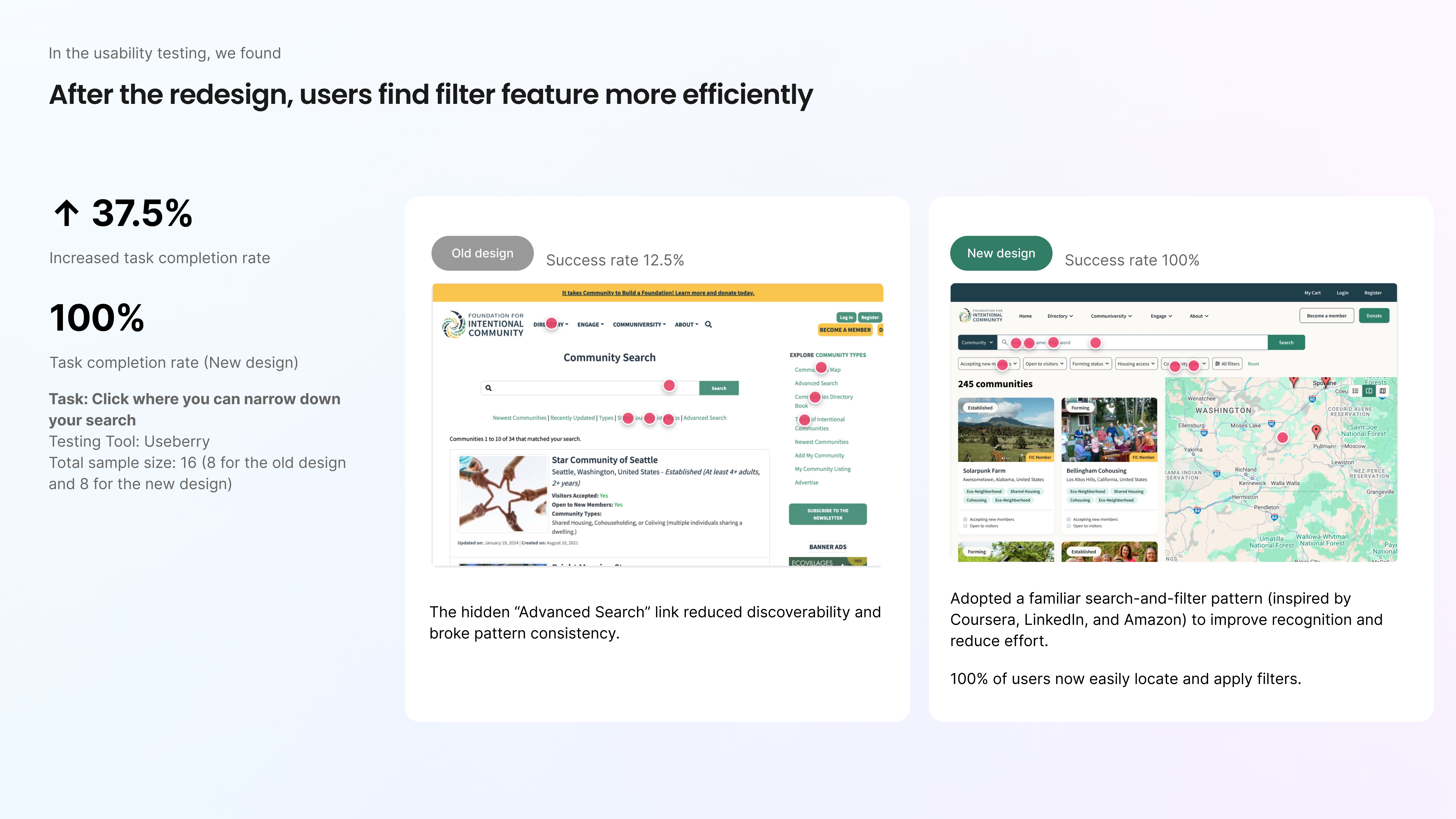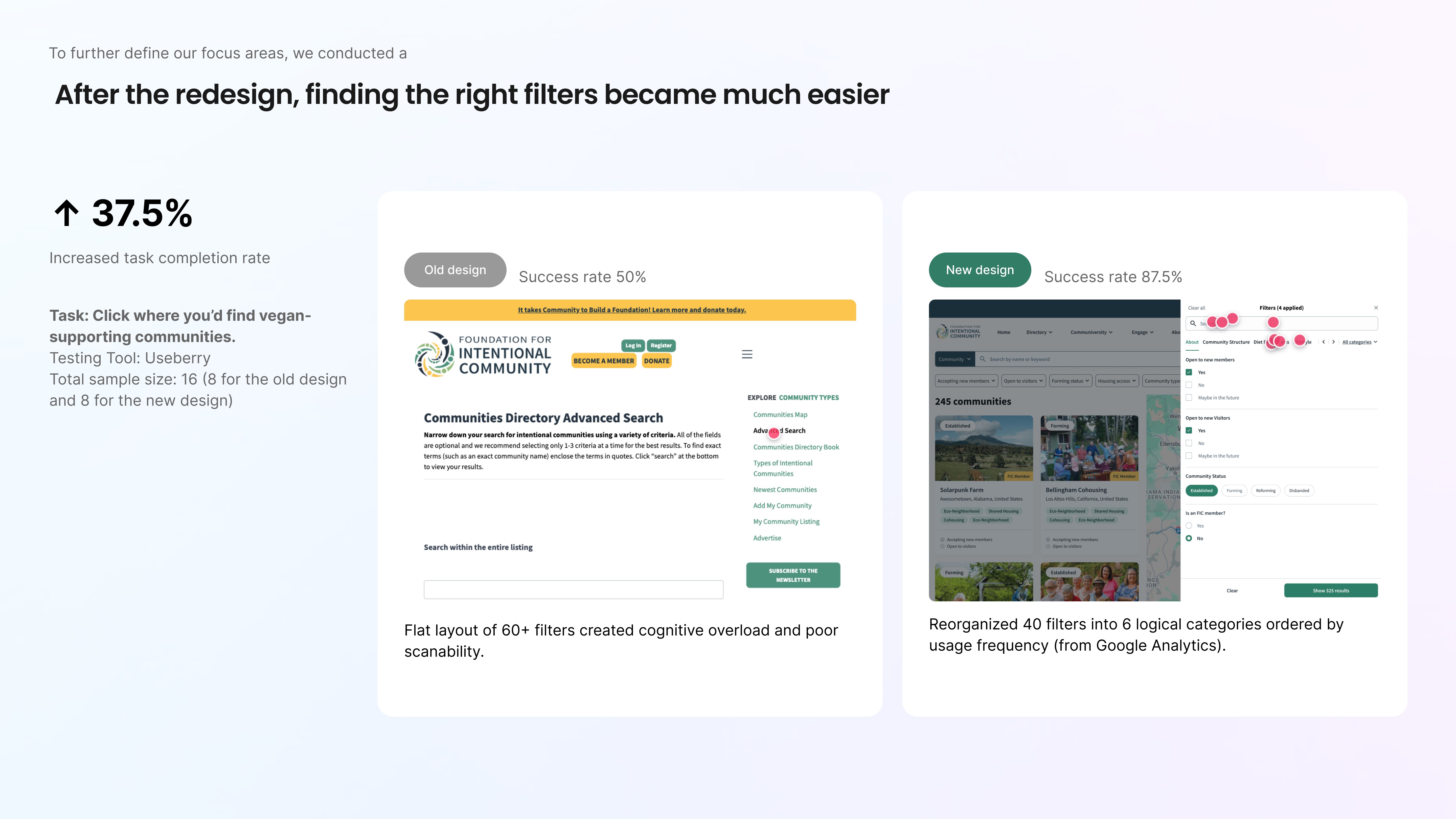 From restructuring 60 filters into prioritized categories, to improving search discoverability by 7x, to reaching 100% task completion, every decision was anchored in evidence.