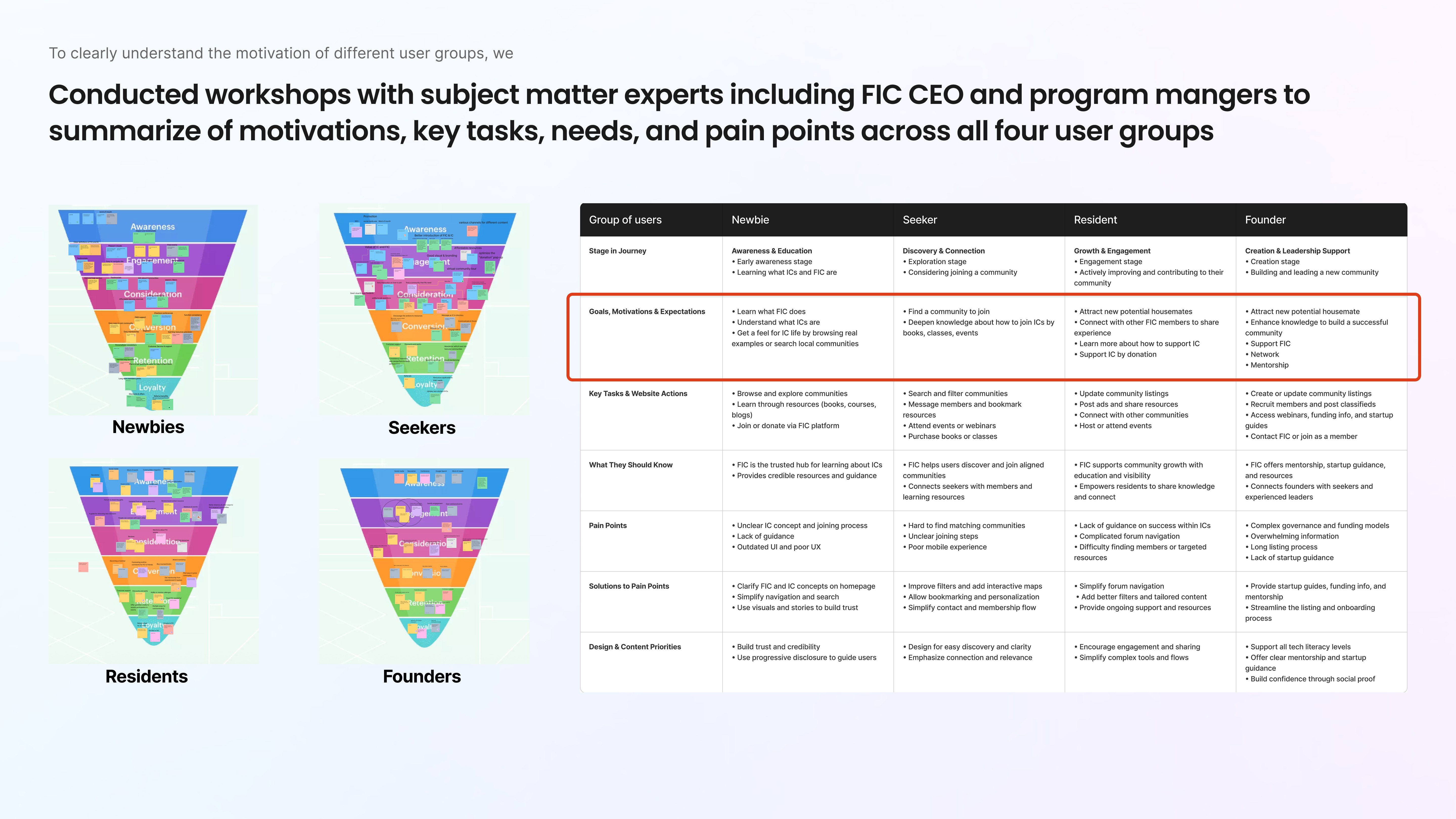 The motivations of different user types (seekers, residents, founders)