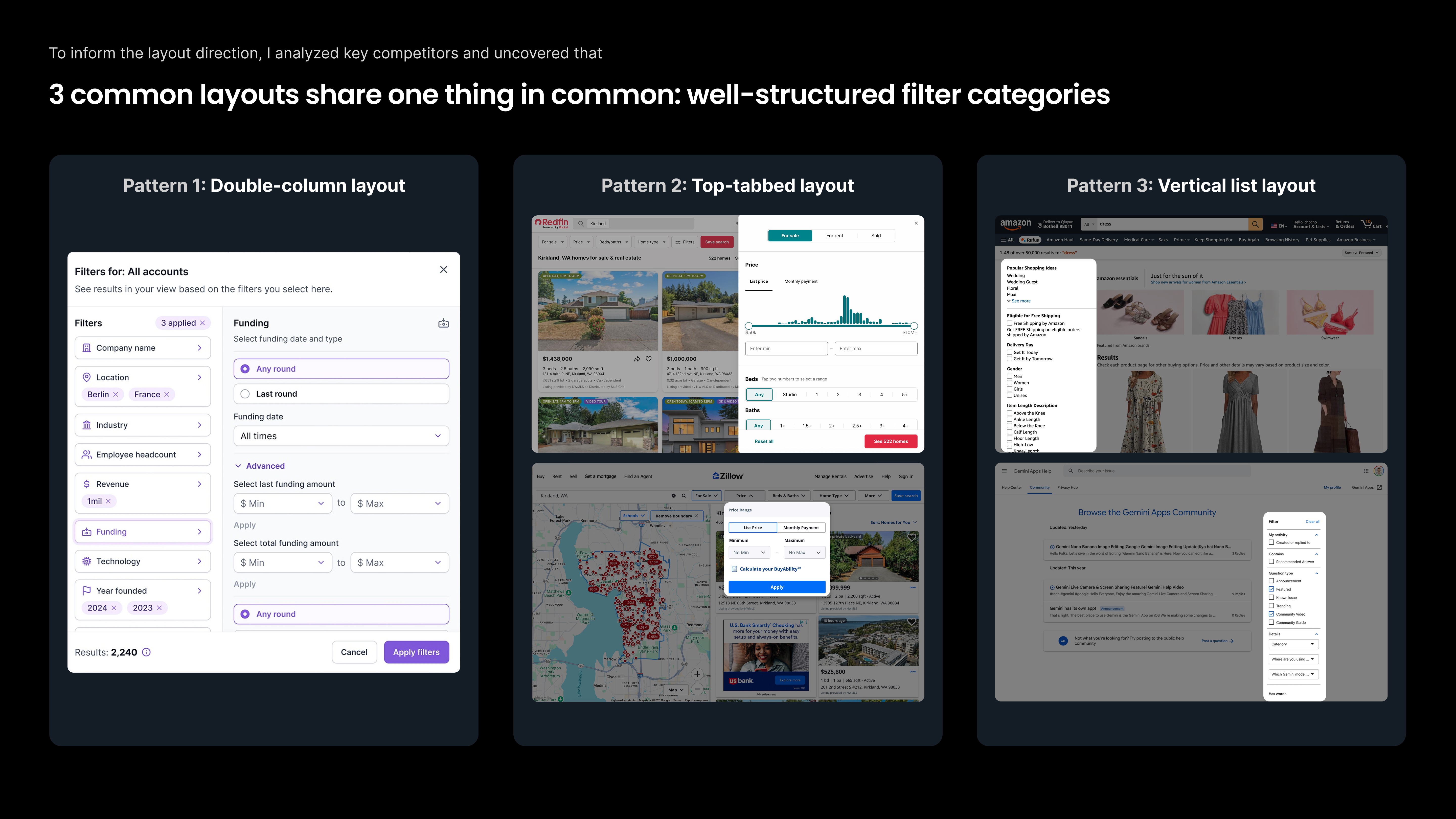 To improve navigability, I did copeptior analysis to summrize the most established filter layout patterns, I found 3 patterns: