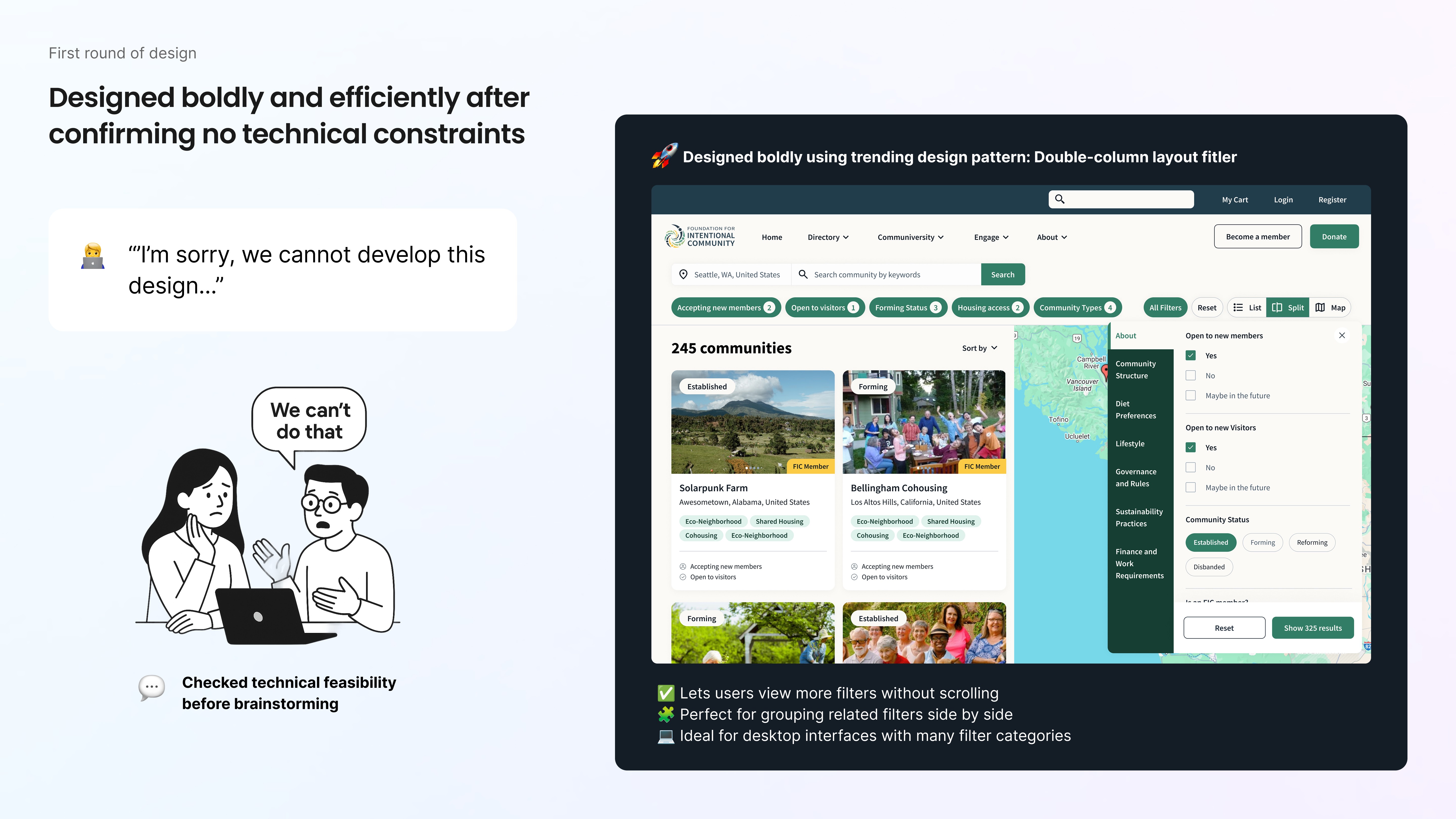 FIC is a global bridge for people seeking alternative ways of living: cooperative housing, ecovillages, and shared-value communities. But while the mission was visionary, the digital experience was a "maze of friction." As a Product Designer, I stepped in to lead the charge in transforming a confusing, data-heavy directory into a trusted, high-converting journey.