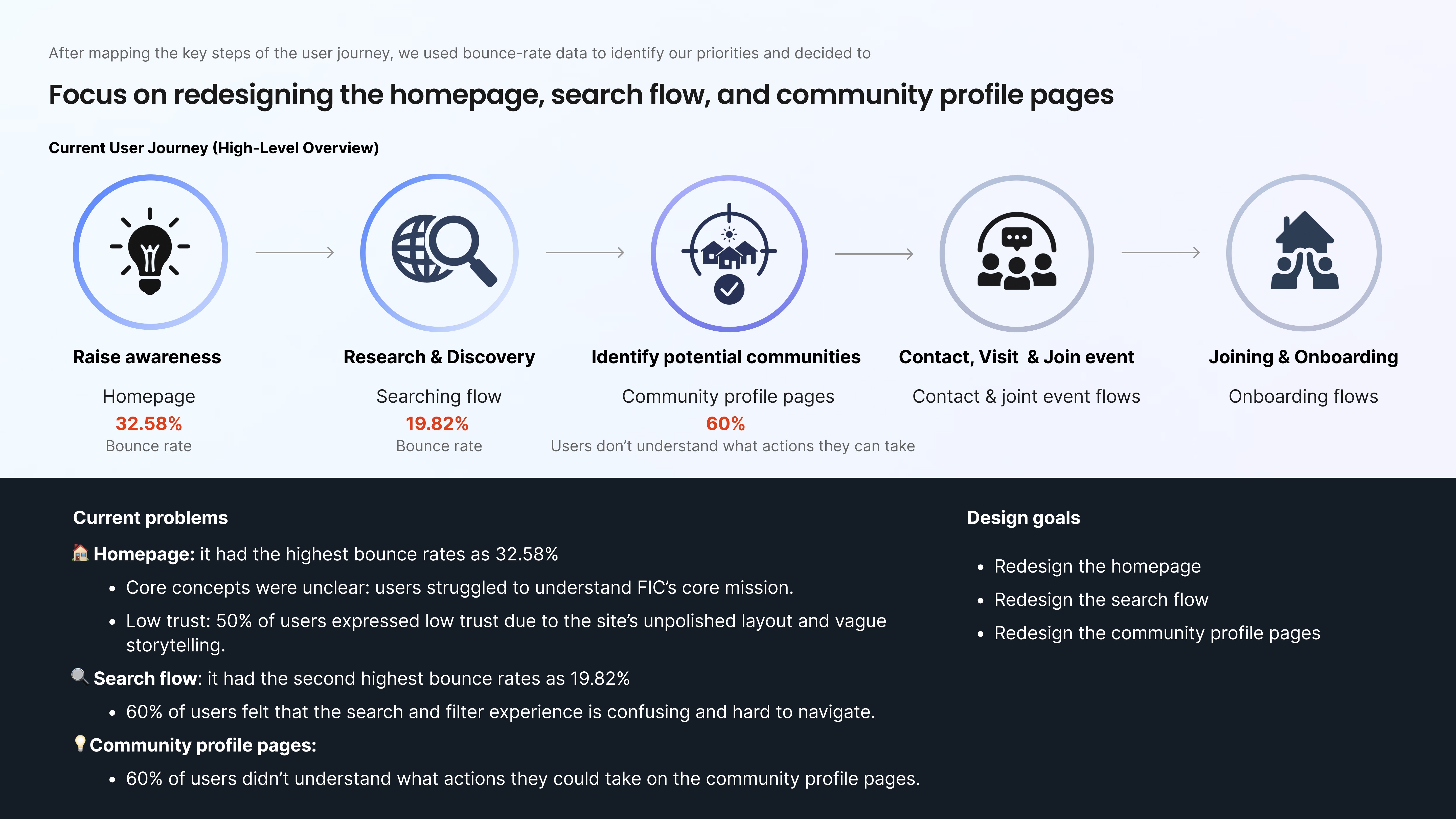 Our initial usability testing hit us with a hard truth: 4 out of 6 users couldn't explain what FIC actually did within 20 seconds of landing. FIC had a "vision gap": a beautiful mission trapped behind a confusing interface.